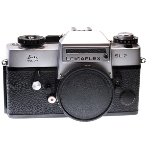 Production era - 1974-1976 Code nos. - 10021-chrom, 10022-black, 10023-mot Motor version - SL2MOT shown with 14077 motor 1971-1977 (also used with SLMOT) early models, 2600 and below, do not allow single exposures. Used with 14181 Handgrip as shown. Special editions - "50 year" in 1975 Description - "Full information about exposure was displayed on the readout in the viewfinder and the sensitivity of the metering had been increased four fold. A separate button was supplied to operate the display illumination. The camera was equipped with a 3mm split image rangefinder screen. The camera back had a safety lock and was opened by a pulling up the rewind handle. The SL2 was available in either satin chrome or black finish. The mirror had been redesigned allowing lenses of 16 and 19mm focal length to be used. There was a hot shoe fitted. The camera shape was more square in appearance, the back being less curved than its predecessors.