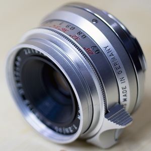 Leica SUMMARON-M 35mm 1:2.8 Leica Order No. - SIMOO 11106 screw-lens; SIMOM 11306 M-version; SIMWO 11106 M3 version with "specs" and caps LLC - 151 Production era - 1958-1963 - 5,289 screw lenses; 1958-1974 - 30,400 bayonet lenses Variants - Screw, M-bayonet, M3 with "specs", 3-crown, "Post" and a few in black versions Lens mount - Leica Screw and M-bayonet Lens /groups - 6 /4 F stop range - f/2.8-f/22 Closest focusing distance - 1 m screw mount, 0.65 m M3, 0.7 m M2 Smallest object field - 390 x 590 mm M3, 430 x 640 mm M2 Diaphragm setting /type - Click stop 10-blade Angle of view diagonal - 64 degrees Filter type - A42, E39 Accessories - Hood: IROOA 12571, 12585, 12526, 12538; Leather case for lens with goggles: 14552 Materials - Chrome plated brass and black paint Dimensions (length x diameter) - 29 x 51 mm / 1.14 x 2.01 in Weight - 210 g / 7.41 oz Inscription - SUMMARON 1:2.8/3.5 LEITZ WETZLAR 1XXXXXX
