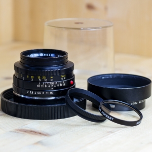 Order nos. – 11215-Leicaflex – 11216-R.only – 11345-ROM – 11217-R.only.Safari LLC – 123 Production era 1976-2009, 99,736+ lenses Lens mount – LEICA R-bayonet for LEICA R3 to LEICA R9 with mechanical, and, for LEICA R8/R9, additional electronic exposure control Variants – Black, Safari green, R-only and 3-cam versions Number of lenses/groups – 6 / 4 Focusing range – 0.5 m / 19.7 in < ¡Ä Aperture range – f/2-f/16 – Preset diaphragm with clickstops (including half values), 6-blade fully automatic diaphragm Smallest object field/Largest reproduction ratio – 180 mm x 270 mm / 1:7.5 Angle of view (diagonal, horizontal, vertical) – 47¡Æ, 40¡Æ, 27¡Æ Position of entrance pupil – 20.2 mm / 0.8 in (related to the first lens surface in light direction) Scales – Combined meter/feet graduation Filter mount/Lens hood – Internal thread for screw-in type filters E 55 / Built-in, telescopic Accessories – ELPRO close focusing attachments type 1 and 2 Viewfinder – Camera viewfinder Materials – Anodized aluminum and optical glass Focal length – 52.5 mm / 2.07 in Length to bayonet flange – 41 mm / 1.6 in Largest diameter – 66 mm / 2.6 in Weight – 290 g / 10.2 oz Inscriptions – LEICA SUMMICRON-R 1:2/50 E 55 3XXXXXX LEITZ SUMMICRON-R 1:2/50 3XXXXXX SUMMICRON-R 1:2/50 LEITZ CANADA 3XXXXXX